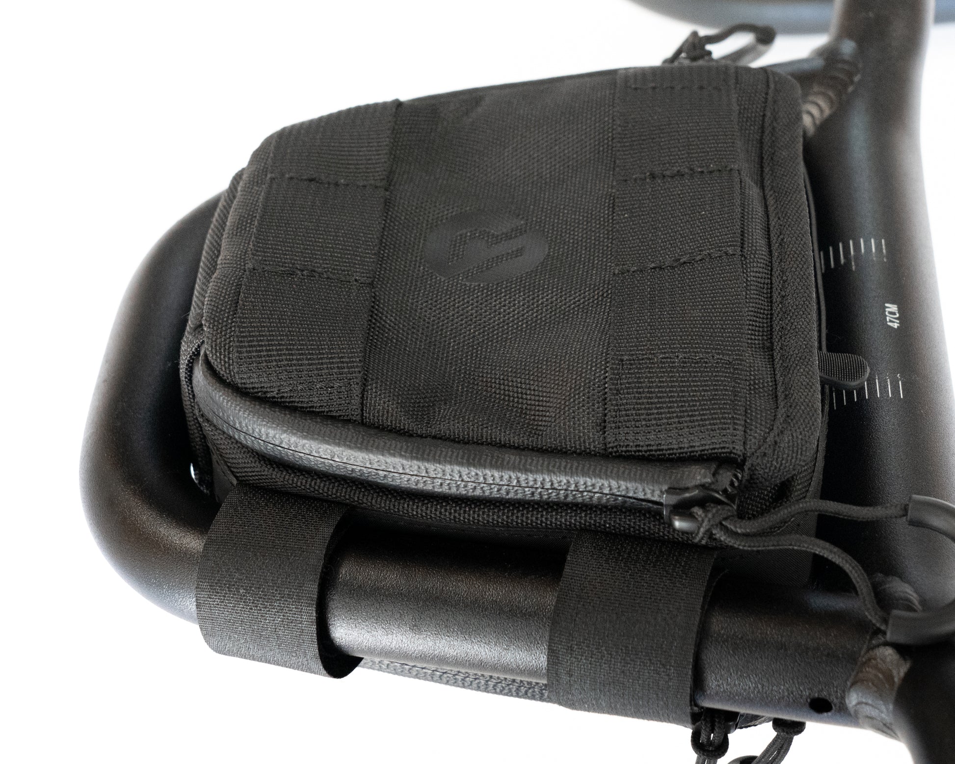 The optional bike computer mount is compatible with Garmin and Wahoo computers and allows you to securely mount your bike computer on top of the bag in an ideal location just in front of the stem. Since the bag is fully supported by the alloy loop of the handlebar, the mount is very stable.